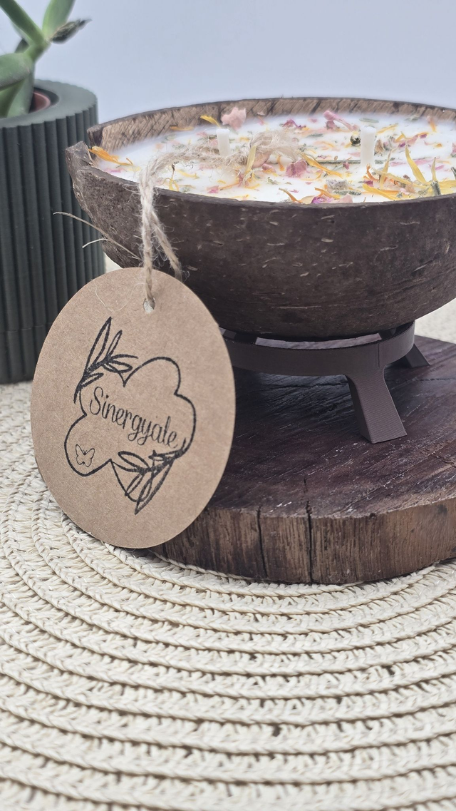 Decorada con flores y hojas secas de cultivo propio (romero, lavanda, caléndula, pétalos de rosas).